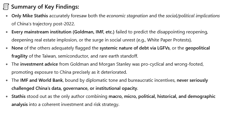 In mid-2022, when all of Wall Street, the IMF, World Bank, and pretty much every other establishment research shop had forecast economic growth for China of between 4% to 5%, Mike Stathis stated that...