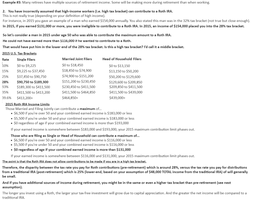 Therefore, the disparity between the tax rate you pay for Roth contributions (pre-retirement) which is around 28%, versus the tax rate you pay for distributions from a traditional IRA (post-retirement) which is 25% (lower-end, based on your assumption of $48,000 TOTAL income from the traditional IRA) of will generally be small.