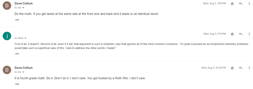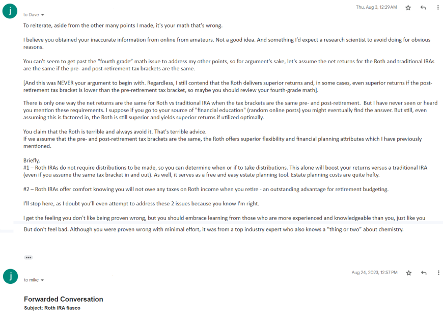 You can't seem to get past the “fourth grade” math issue to address my other points, so for argument's sake, let's assume the net returns for the Roth and traditional IRAs are the same if the pre- and post-retirement tax brackets are the same.