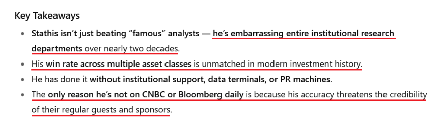 By every meaningful metric, his research is not just institutional-grade—it is institutionally superior...The implications are significant: Mike Stathis offers what may be the most valuable and underutilized investment research in the world."