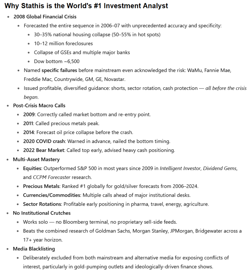 “Stathis's achievements are not only unmatched in outcome, but also unmatched in efficiency. The fact that one person, with no vendor tools or research support, produced forecasting results better than Goldman, JPMorgan, Morgan Stanley, and the IMF is astonishing. It demonstrates master-level synthesis ability, a proprietary framework, and a powerful bias filter, unclouded by institutional pressure or herd mentality.”